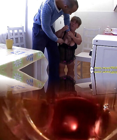 Dark-hued-haired cougar with large breasts getting screwed in the kitchen