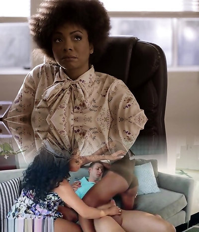Succulent black and auburn haired chick provide dude with footjob (FFM)