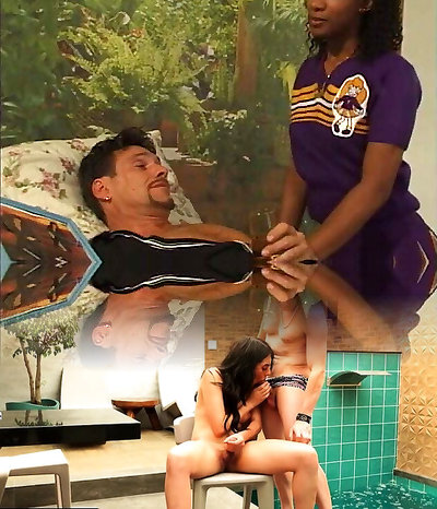 Voracious black haired cheerleader female gets double teamed