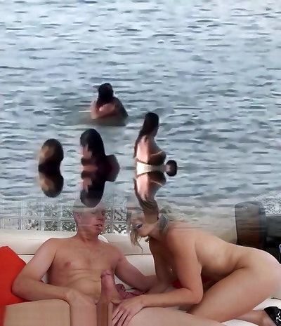 Spycam cuck watches mature wife jerking big dark-hued cock on nude beach