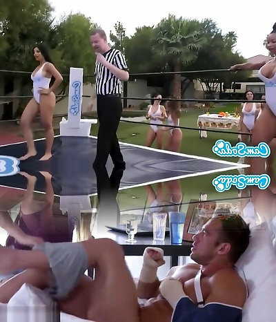 Nubiles covered with oil wrestle and fuck one cock